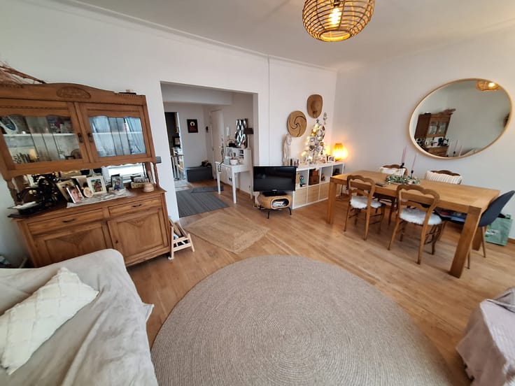 Le bien se compose comme suit : un hall d’entrée de 7m² suivi par un lumineux séjour de 18m² en parquet de chêne massif.